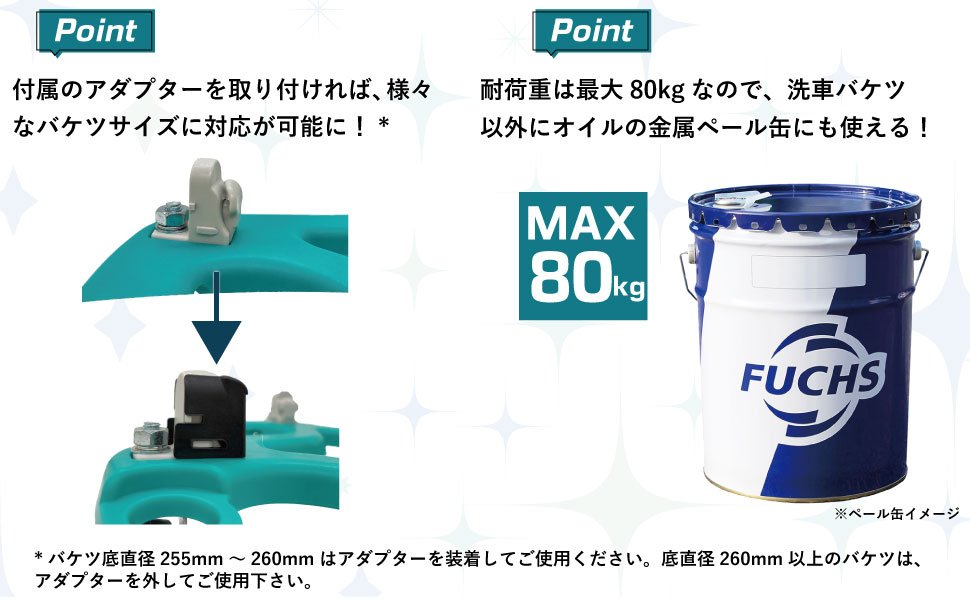 (例)Detail Guardzバケツ14L、18L(バケツ底直径255mm ±2mm)はアダプターを4つ装着し、