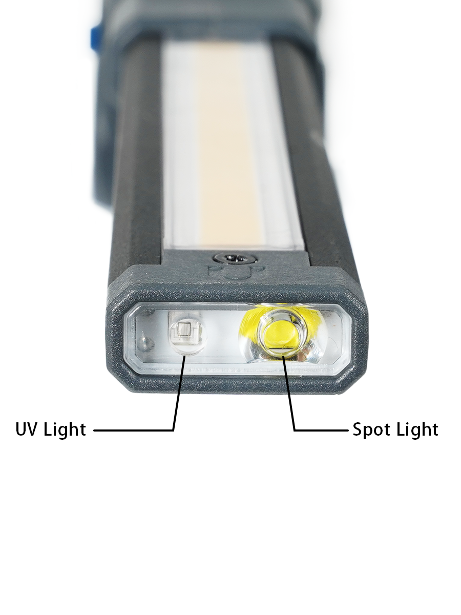 【狭いスペースに対応するマルチライト設計】 狭い場所や手の届きにくい場所を照らす「トップスポットライト」と、フルードの漏れ、汚れなどを検出するための「統合型UVライト」を装備。この一台の多機能ライトが、あなたのワークフローにおける複数のツールに取って代わります。