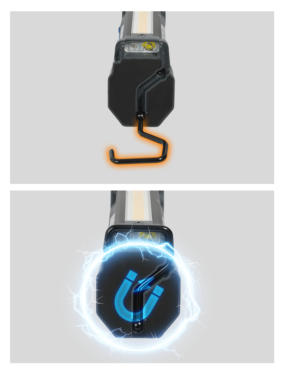 【折り畳み、マグネット、ハンズフリー使用】 強力なマグネットベースを備えた頑丈な折り畳み式設計により、ツールボックス、リフト、または 作業チェアのベース などの金属面にしっかりと固定可能。ハンズフリーでの照明は、長時間のディテーリングや修理作業の効率を向上させます。