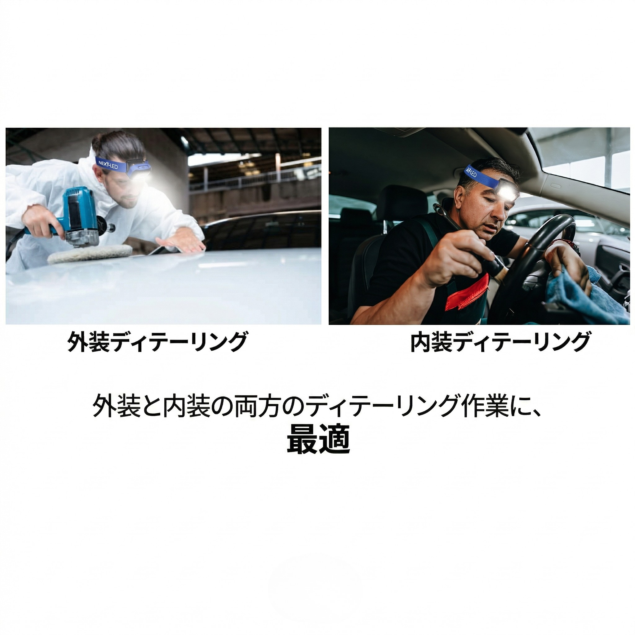 ポリッシング(研磨)やインテリアクリーニング、そしてエンジンルームのメンテナンス。ディテーリングの現場では、常に「最適な光」と「自由な両手」が求められます。NT-2143C-Bは、高演色CRI 95+のチップオンボード(COB)LEDを採用し、頭に装着するだけで作業箇所を太陽光に近い光で均一に照らし出す、プロのためのハンズフリー照明です。