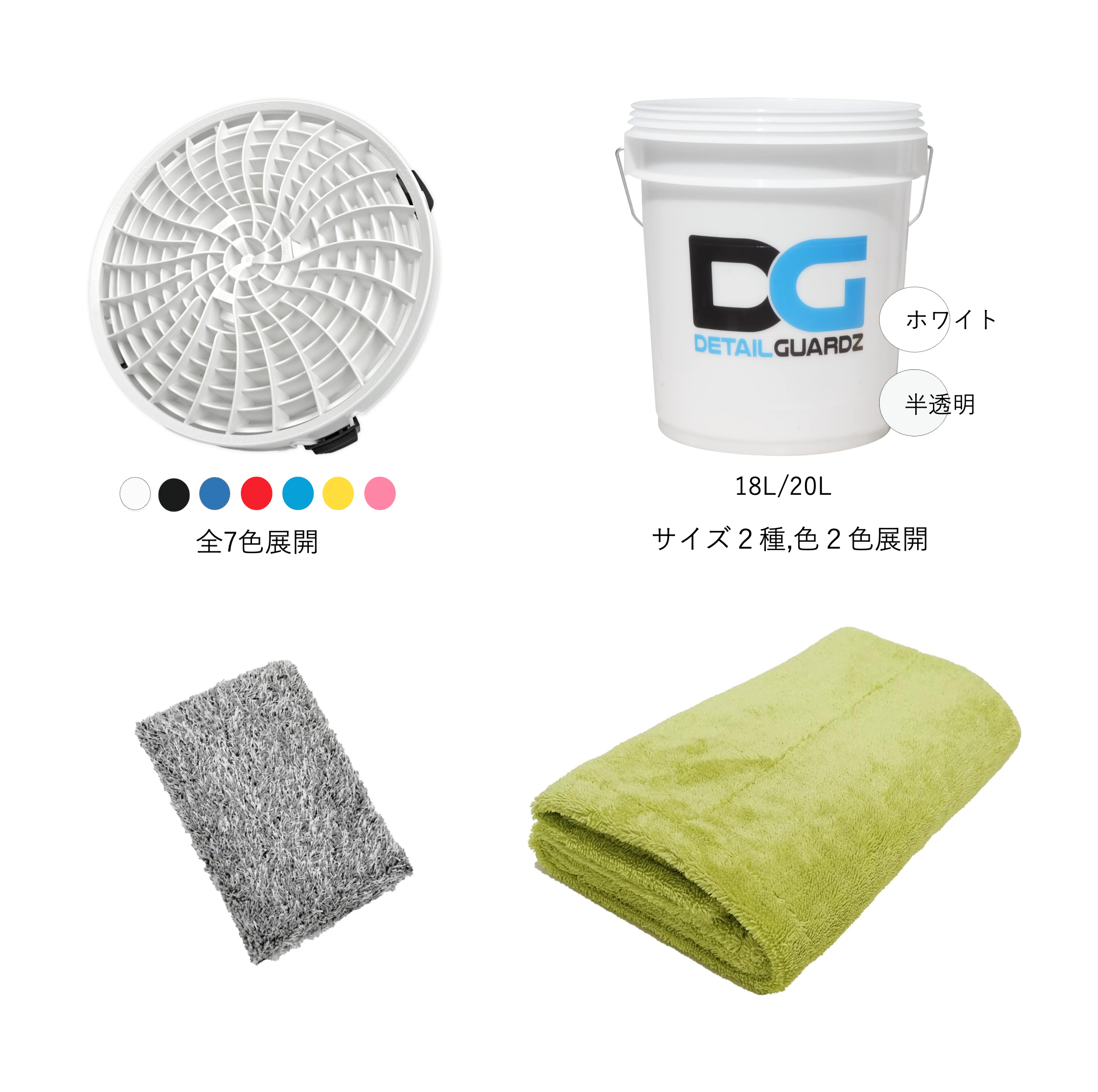 Detail Guardzのバケツフィルターを使ったセットです。洗車キズを最大限に防ぎながら、バケツ洗車から拭き上げまでを安全に行いたい方におすすめ。吸水力に優れた大判タオルを組み合わせているため、タオル傷を防ぎつつ、SUVやミニバンなどの大型車でも短時間で効率よく拭き上げが可能です。これまでにない、新しい洗車体験にきっと驚いていただけます。