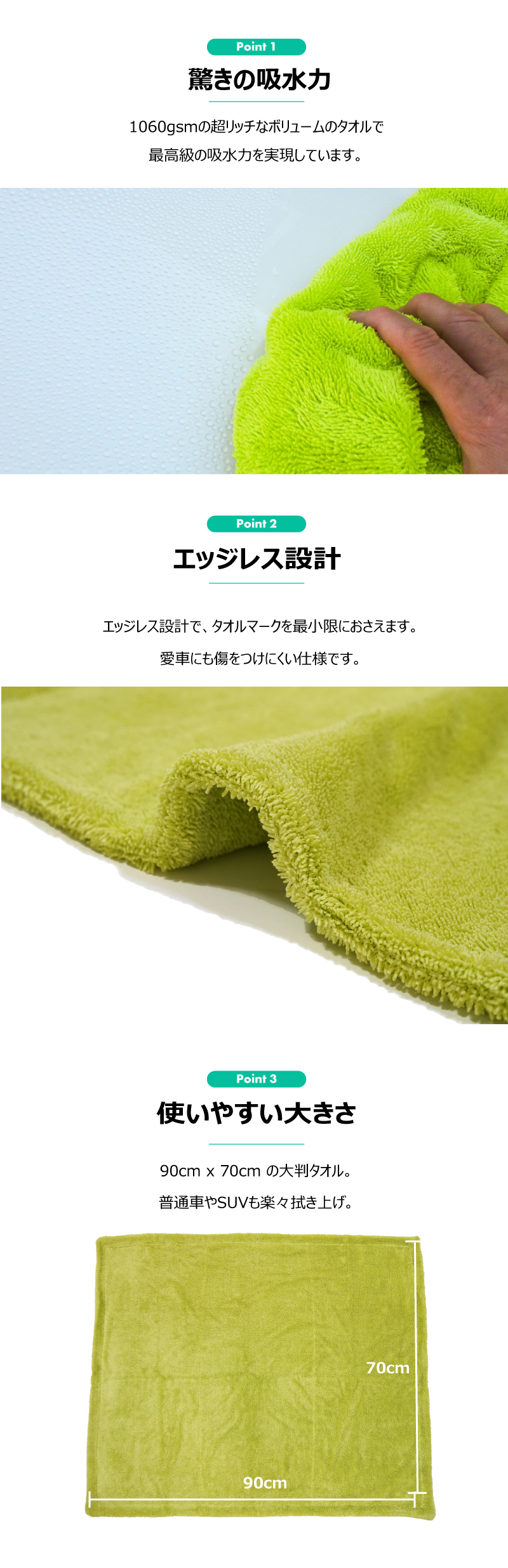 ●90cm x 70cm の大判タオル。普通車やSUVも楽々拭き上げ