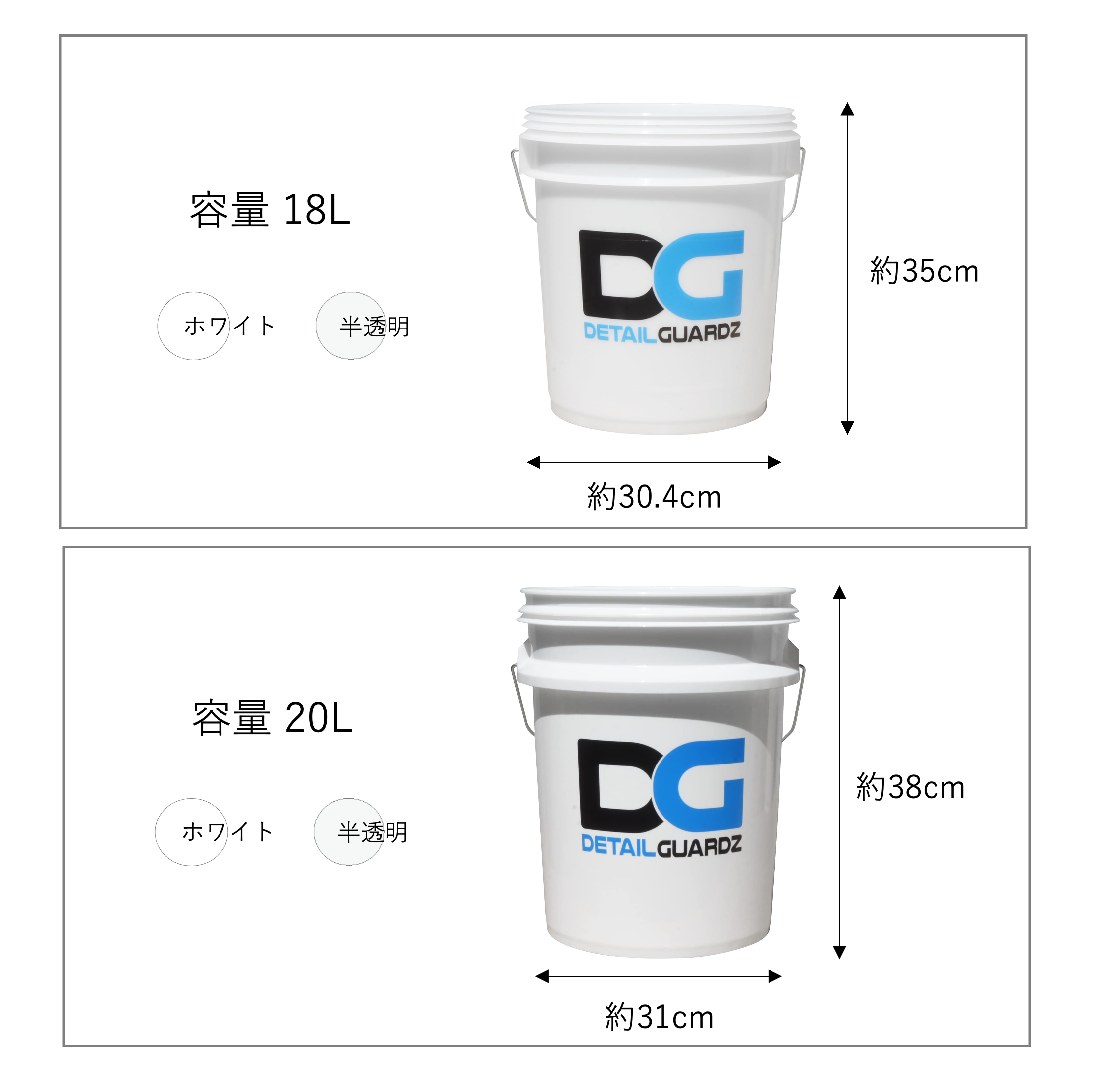 ・洗車、清掃後の汚れがわかりやすい白いバケツです。水量が見えやすいクリアホワイト(半透明)と、汚れが見えやすいホワイトの2タイプをご用意。