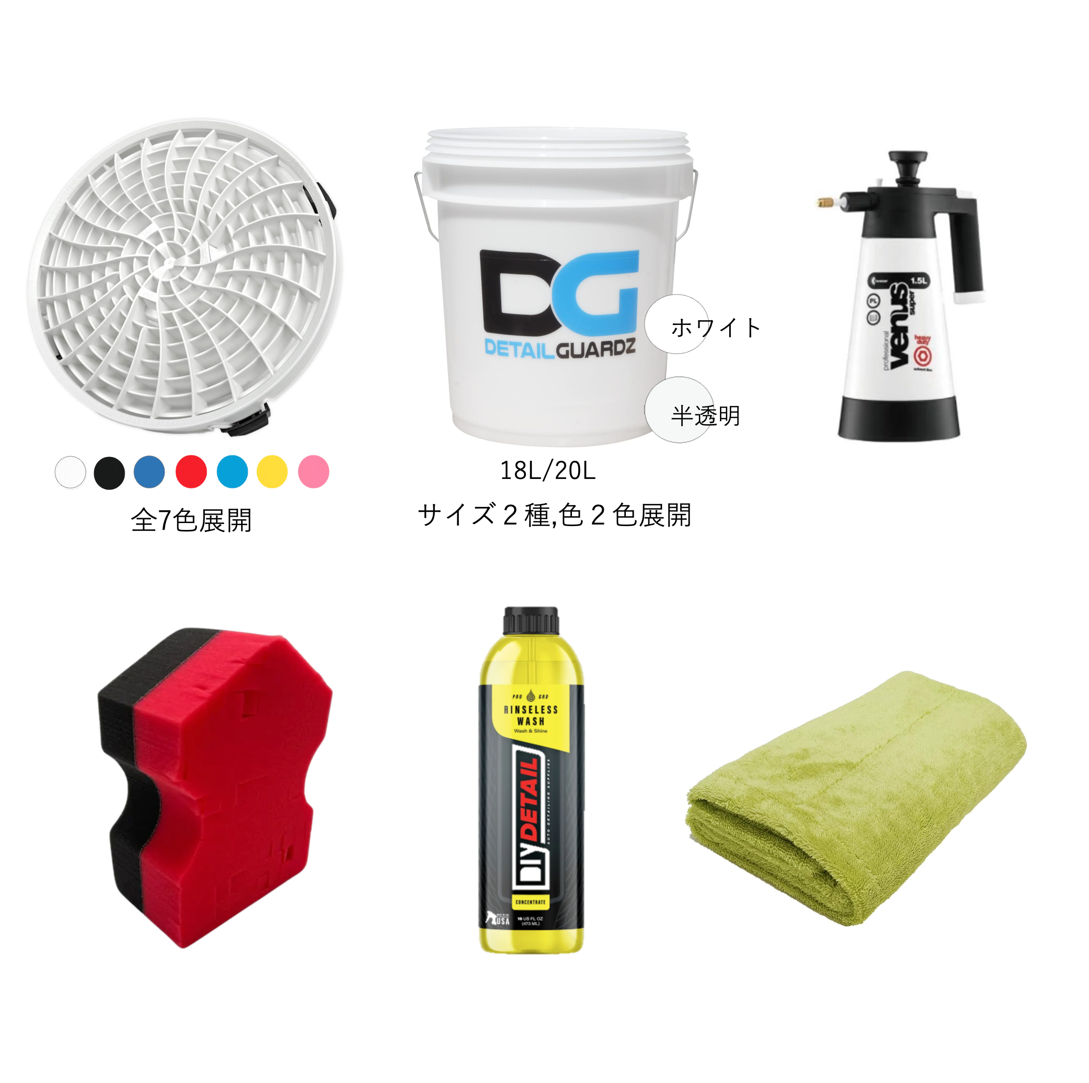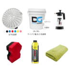 リンスレス洗車を体験したいが、何も洗車道具がない! という方向けのコンプリートセット。リンスレス洗車に対応する大容量のバケツに、洗車キズを防ぐダートロック(バケツフィルター)、リンスレスの王道・DIY DETAILのリンスレスウォッシュとスポンジ、リンスレス溶液をボディに噴霧するためのスプレイヤー、1枚で拭き上げが終わる、プレミアムマイクロファイーバー大判タオルのセットで、どんな方でも安全に失敗なくリンスレスが体験できます。